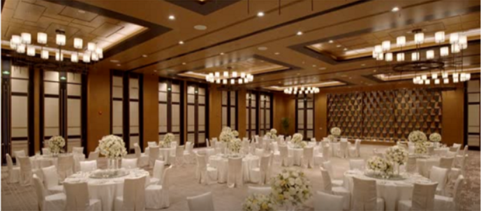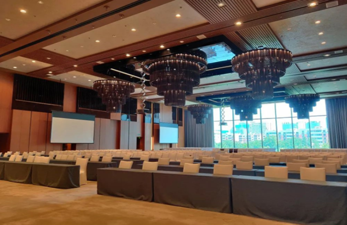 酒店的大宴会厅位于酒店二楼,场地面积1100平米,层高8米。现场扩声采用了EV的12寸吸顶音箱,均匀的声场分布,充足的声压级,让大宴会厅举办的活动,无论是会议还是宴会,扩声都得到了保证。因为场地天花内设备管道众多,施工时使用了更薄的方形箱体,在不破坏装修的情况下,节省了空间,更加的美观。