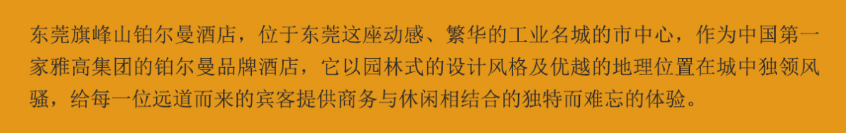 东莞旗峰山铂尔曼酒店,位于东莞这座动感、繁华的工业名城的市中心,作为中国第一家雅高集团的铂尔曼品牌酒店,它以园林式的设计风格及优越的地理位置在城中独领风骚,给每一位远道而来的宾客提供商务与休闲相结合的独特而难忘的体验。