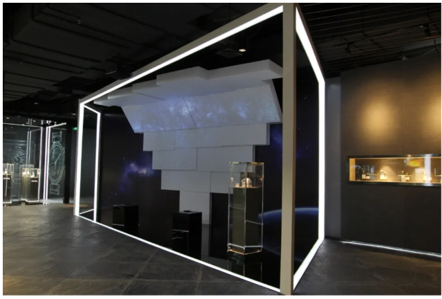 二层为钟表文化体验展厅,该展厅由五个部分组成:临展区:预留投影面、展柜位等空间,满足临时主题展览灵动可变的展示需求。多媒体互动区:通过声光电一体化的多媒体系统介绍腕表的历史与设计演变。手表材料与机芯展示区:通过空间沉浸式造景设计对手表机芯及手表不同结构材料进行展示。机械互动体验区:通过空间造景和多媒体展示,打造虚实结合的体验场景来介绍手表机械装置和工艺。手作体验区:手表拼装体验。