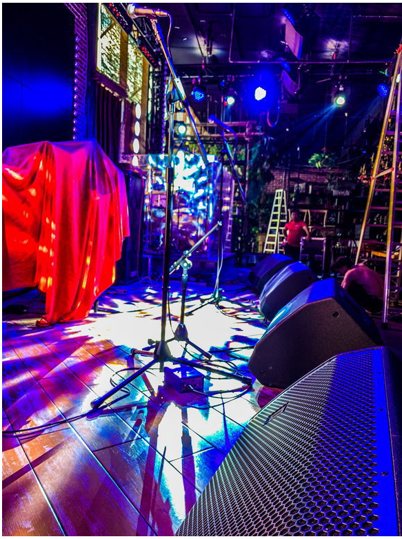 5只JBL PRX815W 15寸有源一体化智能扬声器作为看片在线观看免费监听, 8只SAL的A6全频扬声器根据声场覆盖,均匀布置在餐吧各区区域。DJ监听耳机使用AKG K240 MKII。整套系统由4台西班牙RAMaudio V12044带dante版本的功放驱动。