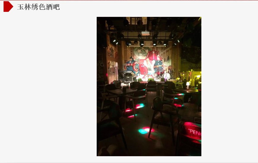 绣色酒吧是玉林市为数不多的现场乐队类型的酒吧,开张之后,生意火爆,并经常邀请国内外的实力派歌手驻场,演奏。