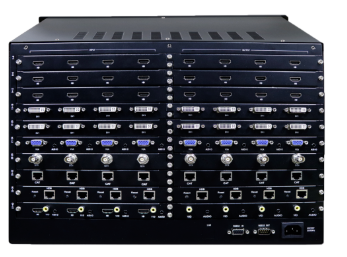 矩阵切换器就是将一路或多路视音频信号分别传输给一个或者多个显示设备,如两台电脑主机要共用一个显示器,矩阵切换器可以将两台电脑主机上的内容任意到同一个或多个显示器上,可切换多路信号输出的设备。