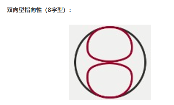 上图显示的是极性模式双向型指向性(8字型),捕捉麦克风正面和背面的声音,意味着对前后区域的声音十分灵敏,而对两侧的声音几乎屏蔽。通常是铝带或大型振膜话筒所持有的“特技”。也是很多立体声以及环绕立体声录音制式的必备技能。