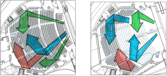 考虑到高层观众离天花更近,回音影响更大,在骑楼、高层处的天花与墙面需要更强的吸音效果。设计师巧妙地将空调回风口与灯架一起设置在天花板与两侧上方,既完成了座椅下送风、顶棚回风的节能空气处理系统,又通过凹凸不平的墙面削弱了回声。