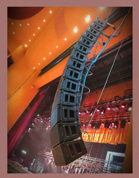 主扩系统采用左中右三组线阵列扬声器结合覆盖的方式,其中左右声道每组吊挂14只EAW RSX208L扬声器,以明装方式,很好地满足了覆盖角度的要求;中置扬声器组则暗藏于声桥中,由10只EAW RSX212L线阵组成,同时配备6只EAW RSX218超低扬声器扩展低频下潜和提升动态。
