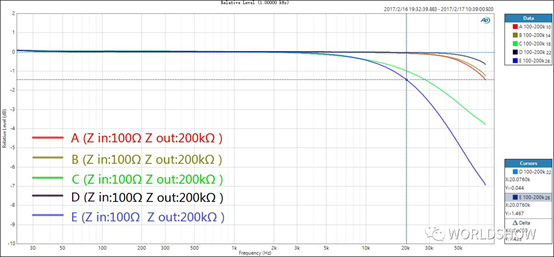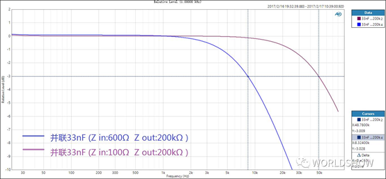 通过以上两幅测试对比,看片在线观看免费基本可以了解专业音频系统中话筒线对信号传输质量的影响,主要表现在高频的衰减上。而对于非专业设备、输出阻抗设计不合理或被错误设置到很高的情况下,会发生怎样的改变?