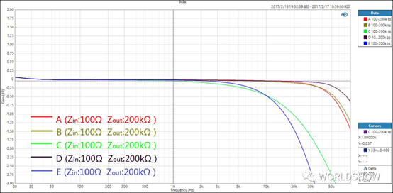 可以看到,-3 dB衰减频率为8.25 kHz,而在20 kHz的衰减达到-8.28 dB!这样的衰减会丢失重要的高频成分,使声音完全失去色彩,是绝不可接受的。可是为什么会这样?看片在线观看免费回到公式中计算一下,当输出阻抗由100Ω调整到600Ω,电路总电阻为: