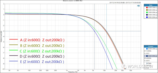 图中可以看到,输出阻抗为600Ω时,所有五款线材在音频范围内都有明显的衰减,传输线路的幅频响应看上去像是专门设计的低通滤波器了。表现最好的是D号线,其截止频率为11.3 kHz,最差的是E号线,截止频率在5.4 kHz。这样的高频衰减,在实际的系统中当然是决不允许的。好在这种情况在高品质的专业级音频设备中通常不会发生,这些设备通常有设计合理的输出阻抗。