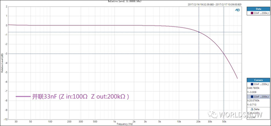 图4:0.5m信号线,在卡侬头2脚(热端)和3脚(冷端)并联一个33nF电容的幅频响应