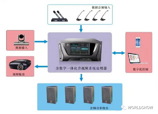 输出端可以独立完成对输出端音频的整理,包括音箱的标准化和声学环境的补偿处理、视频终端的多窗口拼接处理、传输补偿和控制系统的多种格式的控制信号的输出等等。
