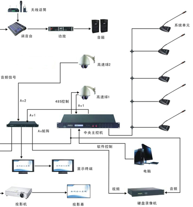 会议系统主要包括投影系统,辅助液晶显示系统,实物展示系统,智能电子白板等,以满足现代化信息交流的需要。通过它可以把电视、DVD、电脑、摄像球、录象机、远程会议图象等视频信号进行还原和展示。
