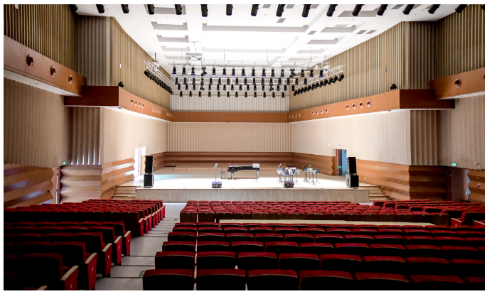 “琴岛”音乐厅建筑面积2100平方米,内部结构呈扇形状,扇形音乐厅的天顶呈等势的递进,目的是令声学能量均匀扩散。在这种音乐厅中,声乐的直接信号更容易送达。