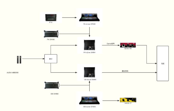 OB调音台至扩声系统通过传统的模拟信号进行传输,并在OB房间的S7000台面上加装了一张Waves卡 用于OB混音。
