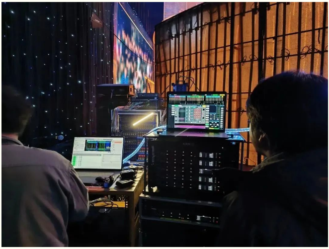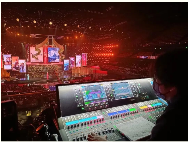 我公司设计团队为西安曲江竞技中心提供了固定安装部分的扩声系统解决方案。本届电影节开、闭幕式现场使用了两张Allen&Heath dLive S7000调音台分别作为PA和OB调音台,搭配两个DM64引擎作为处理核心。