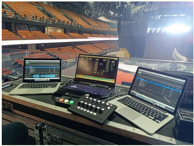 在PA调音台的DM64上插入了一张Dante音频扩展卡,这样就可通过Dante传输的方式,将PA调音台的信号送至现场的扩声系统。与此同时还使用了一个Allen&Heath IP6控制器,将主备两台Q-Lab电脑的四个通道分配到IP6控制器上,极大提升了播放音乐的便捷性。