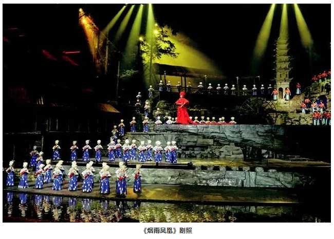 其实,这个方法之前也曾多次使用。不过这次的实践让笔者发现,很多情况下声音的独特效果可以根据舞美场景,甚至利用舞美装置的特性来实现。这一点以后也可以继续跟音响师们研究探讨,从中发现、挖掘并再现出契合戏剧创意的声音效果。例如,国外有的录音棚用老教堂或者工厂厂房改造,以得到想要的声音效果,包括好莱坞的电影录音。这具有无限拓展的可能性,因为每一种声音在不同的空间都会是不同的,关键也在于音响师是否有主观创新的想法,毕竟对于多数戏剧音响设计来说,音响师首先要保证的是戏剧对声音的基本要求,然后才是个性化需求。另外,音响师对舞美空间的解读也尤为重要,举个例子,几年前参加湖南凤凰的《烟雨凤凰》实景演出项目的舞美设计,景的纵深有50 m多,一侧是用于造景的山,一侧是吊脚楼,中间风雨桥作为两者的连接,远处纵深就是利用实景的山和树林。该剧的音响师就根据这样一个悠远的空间环境,制造从左到右的声像差,形成由远及近的声音效果,的确让观众感受到了空间距离上声音传递效果,十分契合舞美所营造出的氛围。